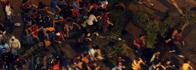 Los incidentes más graves se han producido en el centro de Barcelona, donde varios medios de comunicación habían organizado en la plaza de Catalunya una fiesta para amenizar la fiesta e informar sobre el resultado del partido y que ha durado hasta las 02:00 horas de hoy.