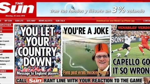 El tabloide "The Sun" titula en toda su portada y sobre una fotografía de los jugadores: "Habéis defraudado al país" y señala que Capello, que cobra seis millones de libras (unos 6,8 millones de euros) al año, debe abandonar su puesto ahora mismo. El periódico popular -que en la contraportada dice que "el tiempo se le termina a Capello, debes marcharte y llevarte a estos perdedores contigo"- afirma que parece que "hay cosas que nunca cambian. Otro Mundial y otra pronta salida de Inglaterra".