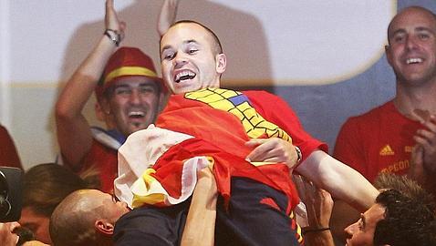Los jugadores de la selección mantean a Iniesta durante la celebración del título en Madrid