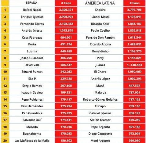 Y es que el F.C. Barcelona es un fenómeno de Facebook, no sólo por ser la segunda página con más tirón del país europeo sino también porque sus jugadores son los más queridos. Andrés Iniesta, David Villa, Xavi Hernández y su entrenador, Pep Guardiola, por partida doble ya que muy pocas de las páginas son oficiales (¿y qué pasará con Cesc?). Por encima de todos ellos un tenista, Rafa Nadal, fan confeso del Real Madrid.