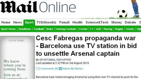 La historia del fichaje de Cesc Fábregas sigue ocupando las portadas de los medios españoles y británicos. Desde allí se acusa al Barcelona de utilizar la propaganda como fórmula de presión para facilitar la incorporación del capitán del Arsenal al conjunto azulgrana. El 'Daily Mail' británico asegura que la entidad que preside Sandro Rosell ha puesto en peligro el traspaso de Fábregas al utilizar su propio canal de televisión (Barça TV) para allanar el camino de cara a la contratación del centrocampista catalán.