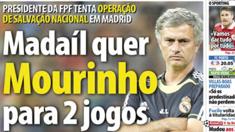 El diario deportivo portugués «Record» asegura este jueves en su portada que Gilberto Madaíl, presidente de la FPF, quiere que Mourinho sea el seleccionador portugués para los encuentros que la selección disputará el próximo mes ante Dinamarca e Islandia. Sería una solución de urgencia tras la destitución de Carlos Queiroz, que dijó adiós al banquillo nacional tras empatar con Chipre y caer en Noruega.