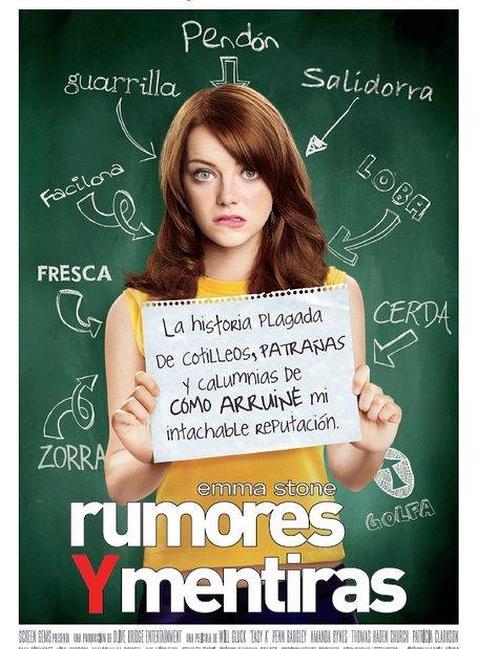En el cartel del filme, que en este momento se promociona en toda España y que se estrenó ayer mismo, aparece la imagen de la joven actriz Emma Stone sujetando una hoja de cuaderno en el que se lee: «La historia plagada de cotilleos, patrañas y calumnias de cómo arruiné mi intachable reputación». La actriz se sitúa delante de una pizarra en la que unas flechas pintadas a tiza la señalan con palabras como 'pendón, guarrilla, facilona, fresca, zorra, golfa, cerda, loba y salidorra'.