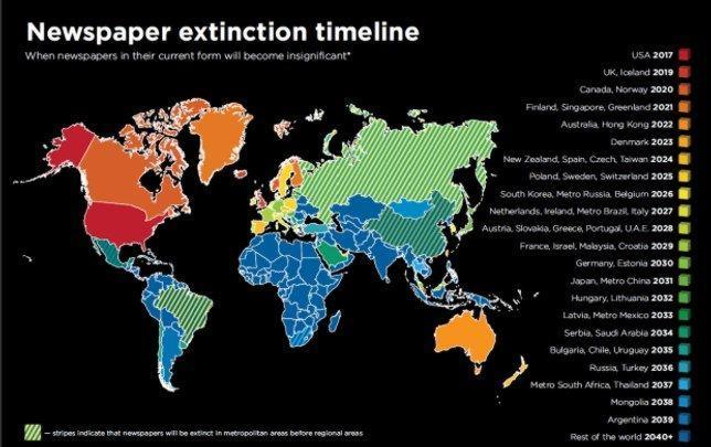 La desaparición de la prensa es una de las cuestiones que suelen aparecer en la mayoría de los encuentros periodísticos y sobre él se viene escribiendo desde hace ya muchos años. Como en todos los debates, existen posturas más o menos pesimistas en torno al futuro de la prensa. En la línea de quienes ven clara la muerte de los periódicos impresos encontramos un reciente estudio que sitúa en 2040 la extinción de la prensa tradicional. El informe, elaborado por Ross Dawson, especialista en este tipo de cuestiones, tiene dos apartados: una infografía sobre los países donde irá desapareciendo paulatinamente la prensa y un ideario con las razones que explican este proceso de extinción.