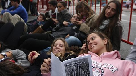 No se acordona la fe y en las inmediaciones de la calle Marina bullen María y sus amigos gritando al Papa bávaro que le esperan en Madrid, una cita que se adivina este fin de semana como el auténtico faro en la espiritualidad de los jóvenes.