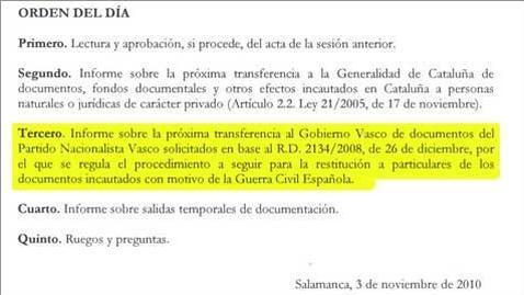 El Patronato del Centro Documental de la Memoria Histórica -el antiguo Archivo Histórico de la Guerra Civil de Salamanca- ha acordado hoy, en una reunión extraordinaria, la transferencia al Gobierno Vasco de los documentos exigidos por el PNV. Este órgano, presidido por la ministra de Cultura, Ángeles González-Sinde, debatió la cuestión en el punto tercero de su orden del día, en el que se especifica que la solicitud de estos papeles se produce «en base al R.D. 2134/2008, de 26 de diciembre, por el que se regula el procedimiento a seguir para la restitución a particulares de los documentos incautados con motivo de la Guerra Civil española».
