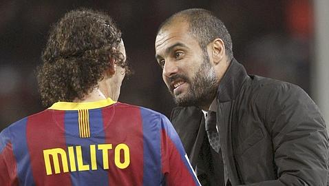 El central argentino del FC Barcelona, Gaby Milito, estará de baja entre cuatro y seis semanas por una rotura del bíceps femoral de la pierna derecha, producida en la primera parte del duelo de la Copa del Rey ante el Ceuta, según las primeras valoraciones de los Servicios Médicos. El defensa, que el pasado 18 de octubre también tuvo una lesión muscular en el aductor del muslo derecho, se lesionó en el minuto 38 de la primera mitad de un partido en el que había anotado el 2-0 y fue sustituido por el francés Eric Abidal. Ahora, el técnico azulgrana, Pep Guardiola, deberá buscar el compañero de Carles Puyol para el partido ante el Villarreal, ya que el habitual, Gerard Piqué, está sancionado, por lo que el galo se perfila como el titular.