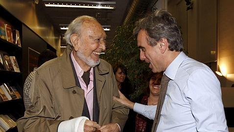 Josep Maria Castellet recibe la felicitación del editor Fèlix Riera al poco de conocerse el fallo del premio