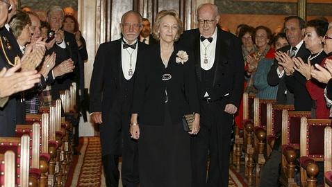 Puértolas seguida de José María Merino y José Luis Boraú en la RAE