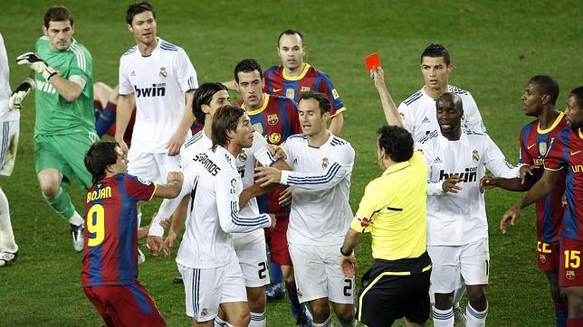 La última acción polémica del partido fue inmediatamente posterior al gesto de Piqué. Sergio Ramos cortaba una contra de Messi, que se lanzaba como un rayo hacia los dominios de Casillas, de una manera desproporcionada, con una dura entrada por detrás. Expulsión clara. De hecho, antes de llegar a la altura del futbolista andaluz, Iturralde ya portaba en su mano la tarjeta roja. Sin embargo casi ni le dio tiempo a mostrársela, pues mientras Ramos se enzarzaba ya en mil nuevas peleas con los jugadores azulgrana y propinaba incluso un descarado manotazo a Puyol.