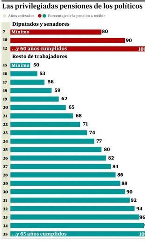 Los parlamentarios pueden disfrutar del 100% de su pensión después de cumplir los 60 años, siempre que hayan ocupado ese puesto durante tres legislaturas (12 años). En cualquier caso, el mínimo de su pensión será del 80%.
