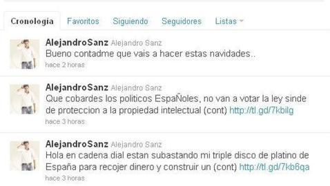 Dentro de la marea de polémica que inunda hoy las redes sociales en general y Twitter en particular, Alejandro Sanz ha arremetido en su perfil de la red de microblogging contra los políticos que voten en contra de la «Ley Sinde». Concretamente, el cantante madrileño ha afirmado: «Qué cobardes los políticos españoles, no van a votar la ley Sinde de proteccion a la propiedad intelectual porque es impopular... Cobardes e hipócritas».