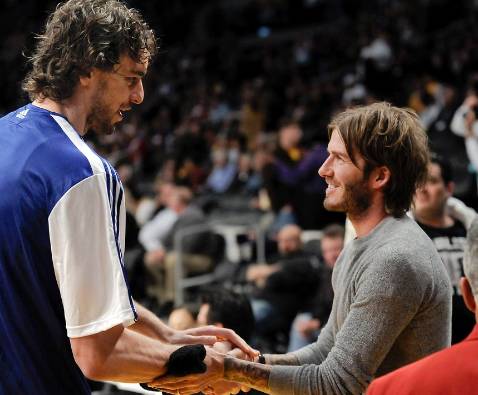 A David Beckham —el futbolista de las mil caras, y no hay más que ver su nuevo lookpara ratificarlo— se le ha visto a menudo en el Stapples Center de Los Ángeles, solo o en compañía (de su familia) animando al equipo de la NBA Los Angeles Lakers, donde milita el español Pau Gasol. El ex jugador del Real Madrid es un confeso aficionado al baloncesto, y durante su estancia en la capital angelina ha aprovechado cualquier ocasión para animar a los jugadores de Los Lakers. Una costumbre que habrá de interrumpirse si se confirman las noticias que le vinculan al equipo inglés del Tottenham, donde podría jugar cedido durante los próximos meses. Pero antes de empezar esta nueva etapa en el fútbol británico, su origen, Beckham se acercó a saludar de nuevo a su amigo Pau Gasol, a quien vio vencer una vez más.