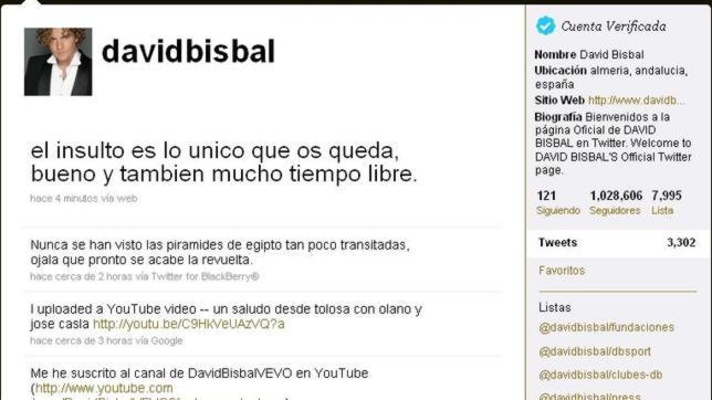 «Nunca se han visto las piramides de Egipto tan poco transitadas, ojalá que pronto se acabe la revuelta». Con este inocente tweet, el cantante almeriense David Bisbal pretendía hacerse eco en su twitter de las revueltas que desde el pasado viernes se desarrollan en Egipto y son portada en los medios informativos de todo el mundo. Sin embargo, esta opinión ha desencadenado un alud de comentarios jocosos en la misma red social en relación a cualquier lugar del mundo.