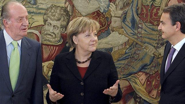 Don Juan Carlos ha dado la bienvenida en inglés a Merkel y ha bromeado ante las cámaras sobre los minutos de adelanto con que ha llegado la canciller alemana, quien ha comentado a su vez con el Monarca en tono distendido cómo mañana Rodríguez Zapatero y ella volverán a reunirse, pero esta vez en Bruselas, junto al resto de líderes europeos. Durante su encuentro en el despacho del Rey, el jefe del Estado español y la canciller alemana han tenido ocasión de abordar las últimas iniciativas españolas y europeas para superar la crisis económica y financiera. Las medidas impulsadas o propuestas para favorecer la salida de la crisis financiera y el euro serán objeto de debate en la cumbre hispano-alemana que se celebrará a continuación en el Palacio de la Moncloa, en la que también ocuparán un lugar importante las cuestiones relacionadas con la cooperación bilateral, la situación en el norte de África y las energías renovables. La jefa del Ejecutivo germano acudirá a su cita con Rodríguez Zapatero en la Moncloa acompañada por sus ministros de Asuntos Exteriores, Finanzas, Economía. Trabajo y Asuntos Sociales, Transportes e Infraestructuras y Educación y Ciencia.