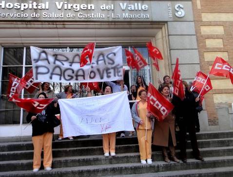 La empresa «Aracas» es la concesionaria del servicio de limpieza en los hospitales Virgen de la Salud, Virgen del Valle y Centro de Especialidades de Toledo. Según la presidenta del comité de empresa de Aracas, los trabajadores no dejan de tener problemas para cobrar sus nóminas desde que el pasado mes de agosto se hizo cargo de la concesión. Así, desde entonces, raro es el mes que no tienen retrasos en el cobro de su sueldo, lo que se ha agravado por el impago de la paga de beneficios que tenían que haber cobrado el 30 de enero.