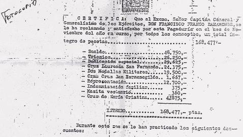 Pero éste sería el capítulo oficial; otros documentos inéditos, rescatados la Ley de Memoria Histórica y archivos de la Fundación Franco, dan cuenta de unos emolumentos muy superiores a los declarados en esta «nómina» oficial, que no sería más que un sobresueldo. El Ministerio de Hacienda, por orden del Gobierno franquista, ingresaría cada mes 600.000 pesetas al dictador, por sus labores como Jefe del Estado. Pero la cosa no queda ahí: la propia Jefatura del Estado contaba con una asignación anual de 30.900.000 pesetas; la Jefatura de la Casa Civil, 20.987.000 pesetas.