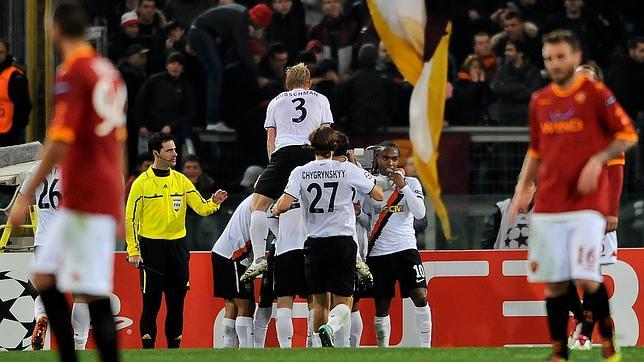 Los pupilos de Lucescu no notaron los dos meses que llevan sin jugar un partido oficial por el parón invernal de la liga ucraniana y, gracias a los goles de los cariocas Jadson, Douglas Costa y Luiz Adriano en la primera parte, dejaron la eliminatoria muy favorable para la vuelta. Por parte de la Roma anotaron Perrotta y el francés Menez.