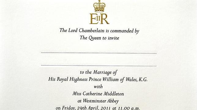"Por deseo expreso de su Majestad Isabel II, Reina de Inglaterra, le invitamos al enlace de su Alteza Real el Príncipe Guillermo de Gales con la señorita Catherine Middleton", rezan las letras de oro de la postal enviada por la Oficina de Lord Chamberlain y que cuenta con el sello de la reina.