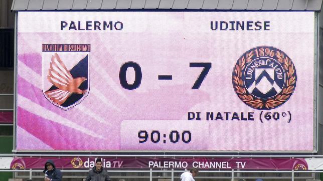El Palermo sufrió hoy la peor derrota de su historia al perder en casa por 0-7 ante el Udinese, en un partido que pasará además a la historia de la Primera División de la Liga italiana como el segundo en el que, al término de la primera parte, el marcador mostraba un 0-5.