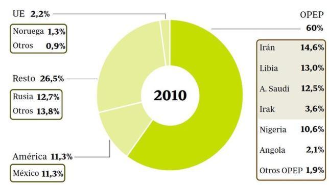 Las importaciones de crudo procedieron en un 60% de la OPEP (Organización de Países Exportadores de Petróleo) y un 40% del resto. El origen está muy repartido, fundamentalmente por motivos de seguridad, siendo Irán (14,6% del total), Libia (13%), Rusia (12,7%), Arabia Saudí (12,5%) y Nigeria (10,6%) nuestros principales proveedores.