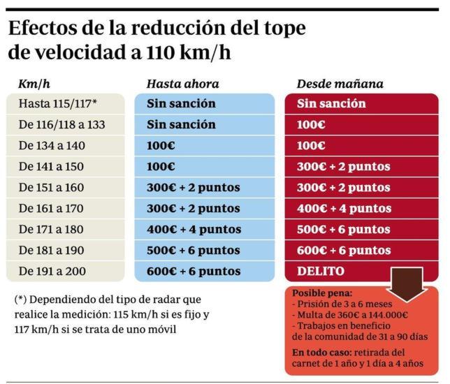 Esto quiere decir que hasta los 115 km/h (radar fijo) o 117 km/h (radar móvil) no habrá sanción, pero entre esa velocidad y los 140km/h la multa será ya de 100 euros. Si el exceso de velocidad está entre 141 y 160 km/h. la sanción es de 300 euros y retirada de 2 puntos. Entre 161 y 170 km/h, 500 euros y 6 puntos. De 181 a 190 km/h, 600 euros y 6 puntos; y a partir de 191 km/h, será delito (prisión de 3 a 6 meses, retirada del carné, trabajos en beneficio de la comunidad y multa de 360 a 144.000 euros).
