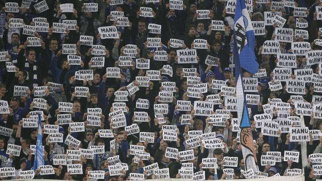 Minutos antes del inicio del partido se han podido ver miles de pancartas que pedían al portero, que también es el capitán del equipo, que siga en Gelsenkirchen. Con un escueto «Manu bleib!», «Manu quedate», la hinchada del Schalke 04 ha dejado claro que no quiere perder al cancerbero que ha ocupado la portería del Veltins Arena durante los últimos cuatro años.