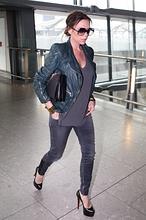 Como buena «fashion victim» y diseñadora que es (estuvo nominada a los British Fashion Awards en 2010) la «celebrity» no renuncia a vestir a la última. Vestida con unos ajustados vaqueros pitillo, chaqueta «perfecto» de cuero y una camiseta de tirantes holgada (que dejaba vislumbrar levemente su embarazo), Victoria paseó por el aeropuerto de Londres, manteniendo su apretada agenda de viajes. Como complementos, sus básicos: gafas de sol XXL y unos altísimos tacones firmados por su zapatero de cabecera, Christian Louboutin.