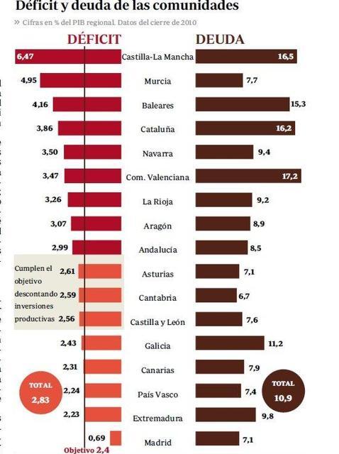 La agencia de calificación Moody's rebajó la pasada semana la calificación crediticia de la deuda española argumentando, precisamente, sus dudas sobre que las comunidades autónomas puedan cumplir sus objetivos de reducción del déficit. Y es que la reducción del déficit previsto para este año es muy superior a la llevada a cabo en 2010, lo que parece harto difícil en año electoral.