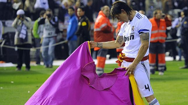 Sergio Ramos recogió el papel de Raúl González en la celebración del título de la Copa del Rey que el Real Madrid ganó al Barcelona en la prórroga, y con capote en mano dedicó a los aficionados madridistas medias verónicas provocando olés.