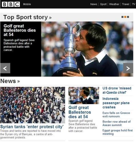 La «BBC» destaca en su portada al golfista, y recoge las palabras de Peter Alliss, comentarista de golf de la cadena, que recuerda así a Ballesteros; «Era un luchador, lleno de habilidades, fresco y adorable. Cuando Seve estaba de buen humor, el mundo era feliz».
