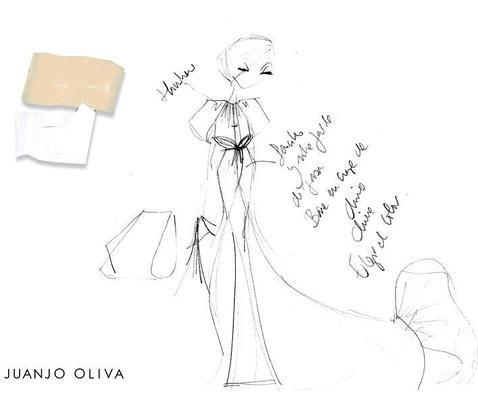 Juanjo Oliva, ganador al Premio L'Oréal al Mejor Diseñador de Cibeles Madrid Fashion Week (por tercera vez en su carrera) propone un diseño sofisticado y elegante para el gran día de la duquesa de Alba. Apuesta por marcar los hombros y la cintura, con un diseño elaborado en gasa y crêpe de chine.
