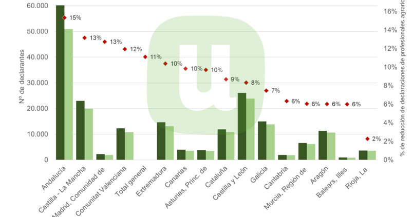 A nivel estatal, los tramos profesionales (más del 50% de ingresos totales procedentes de la actividad agraria) se habrían reducido en un 11,1% respecto de 2018; una tónica con la misma tendencia se habría dado las CCAA, de Andalucía (reducción del 15% de declaraciones de estratos profesionales), Madrid (13%), Castilla-La Mancha (13%), Comunitat Valenciana (12%), o Extremadura (10%), si bien esta tendencia es generalizada en todas las autonomías.