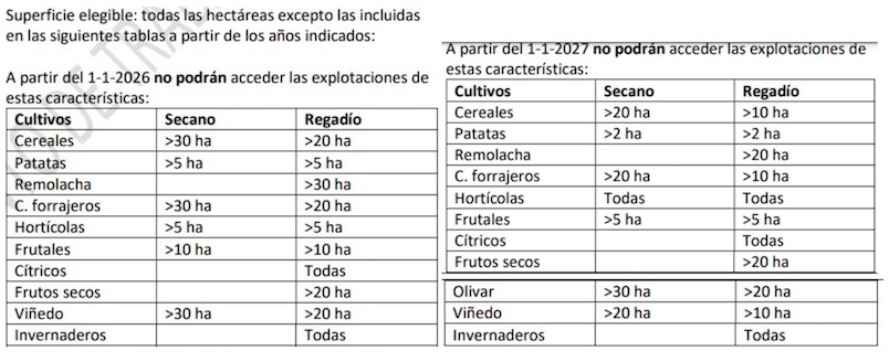 El quinto ecoesquema se refiere a la «Agricultura de precisión», y se pide contar con un cuaderno de explotación electrónico, un abonado sostenible y contratar un servicio de asesoramiento técnico. Eso sí, en el documento se especifican una serie de explotaciones que, a partir de 2026, y 27 no podrán acceder a estos ecoesquemas. Son los siguientes: