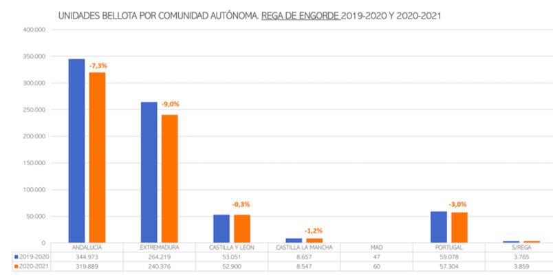 Por comunidades, en Andalucía se han engordado el 46,8% de los animales de bellota (319.889 animales) con un descenso del 7,3% con respecto a la campaña anterior; en Extremadura se engordaron el 35,2% (240.376 animales) con un descenso del 9%, y en Castilla y León el 7,7% (52.900 animales) con un descenso del 0,3%. Por su parte, en Portugal se sacrificaron 57.304 animales de bellota, lo que supone el 8,4% del total de animales sacrificados, con un descenso del 3% con respecto a la montanera anterior.