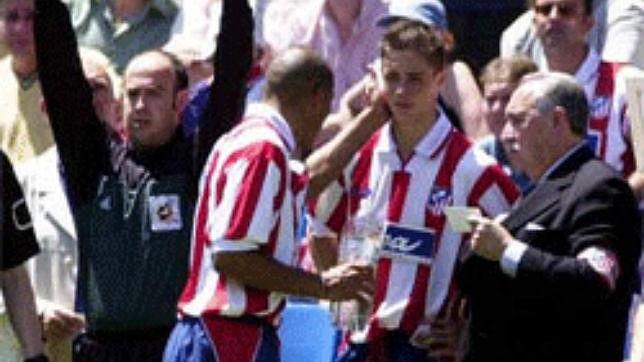 Torres debuta en el Atlético el 21 de mayo de 2001, en un partido de Segunda División entre el Atlético y el Leganés. En el banquillo rojiblanco está Carlos García Cantarero. Torres sale en el minuto diez de la segunda parte sustituyendo a Luque, autor dos minutos antes del gol que dará el triunfo al Atlético. En la imagen, el defensa argentino Juan Gómez da ánimos a Torres antes de salir.