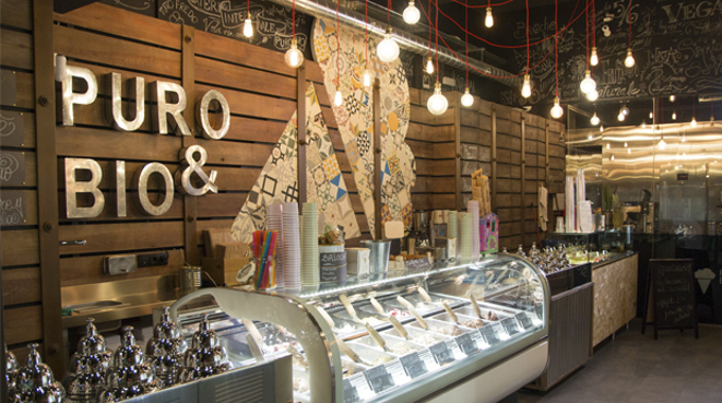 Puro & Bio, que es la heladería ecológica más reconocida de Italia, abrió su primera franquicia en España hace un año en Sevilla. En tan poco tiempo se ha convertido en la heladería de referencia para los amantes del helado artesanal, biológico y natural. Su éxito se basa en los tres pilares de su filosofía empresarial: la producción diaria en cada una de sus heladerías, la utilización de materias primas ecológicas escogidas entre los mejores productores ecológicos de todo el mundo, y una oferta de helados para todos, los tradicionales de leche; helados veganos elaborados a partir de leche de arroz y sin azúcar; helados de fruta; yogurt helado con frutas de temporada y toppings a elegir; granizados y batidos preparados al momento; café ecológico italiano; postres artesanales; tartas semifrías y heladas…