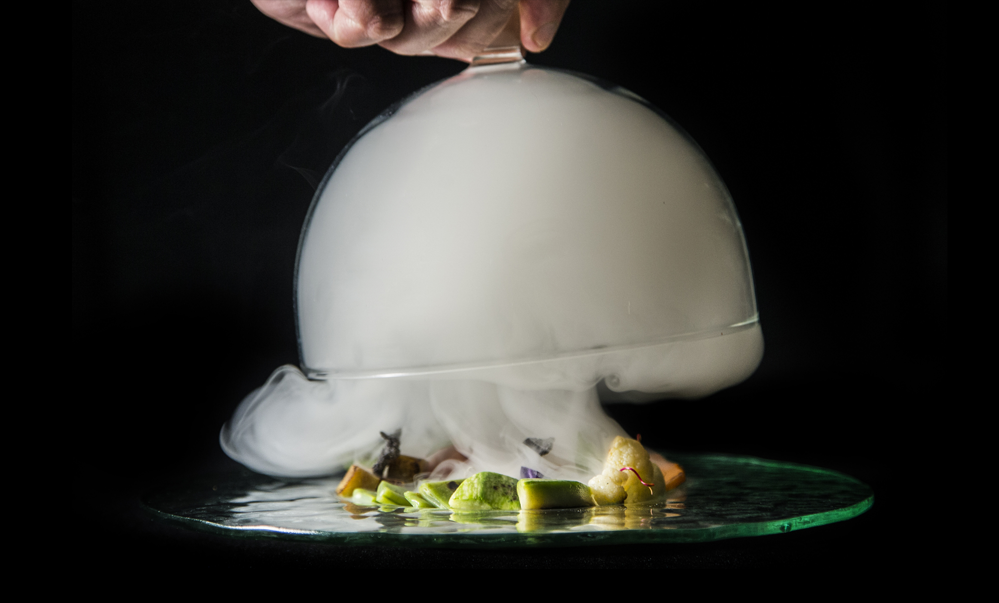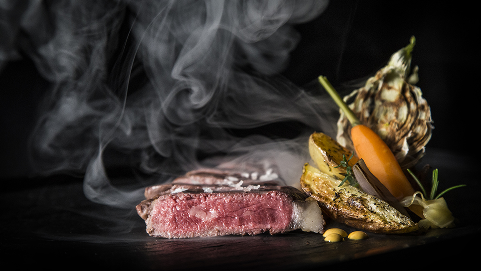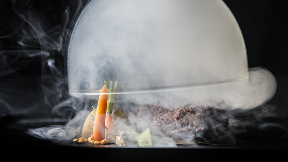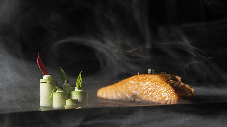 Entre sus platos principales encontramos salmón al vapor ahumado al instante, presa ibérica a la brasa con aroma de oliva verde, verduras ahumadas con con ajos tiernos, paletilla de cordero al carbón de encina, lomo de vaca madura con humo de boletus, solomillo de buey al foie con aroma de roble… A los que hay que añadir unos sugerentes platos ricos para compartir como los huevos estrellados con patatas trufadas, jabuguito y jamón, tataky de buey con helado de parmesano o sus tiras de chocos maceradas en lima y ajitos.