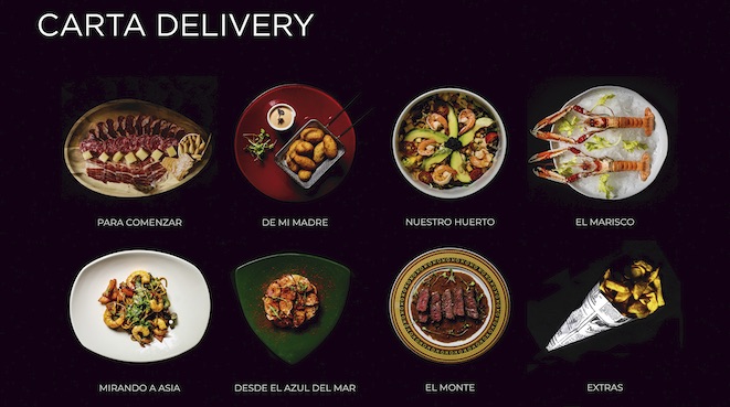 En el apartado «de nuestro huerto» se puede degustar en casa los champiñones al jerez con ajitos y taquitos de jamón y el tortillón de setas y patata trufada. Sigue la propuesta con marisco (gambas blancas de Huelva, langostinos de Sanlúcar, cigalas de Isla Cristina y carabineros) y sabores de Asia: maki mix (sushi variado), chop suey de verduras con noodles, wok de verduras.