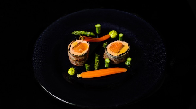 El segundo menú comienza con una cremita del puchero con albóndigas de ave y jamón. Y sigue con un variado de jamón ibérico de bellota 959, caña de lomo y tacos de queso viejo puro de oveja. De primer plato ofrecen verduras naturales salteadas con foie o langostinos (a elegir). Y de segundo se puede elegir entre noisette de salmón fresco con crema de espárragos verdes, meloso de ternera asada con reducción de su propio jugo sobre cremoso de patatas trufadas y boletus salteados. Por último, el postre especial de Navidad 2020. El precio es 45 euros.