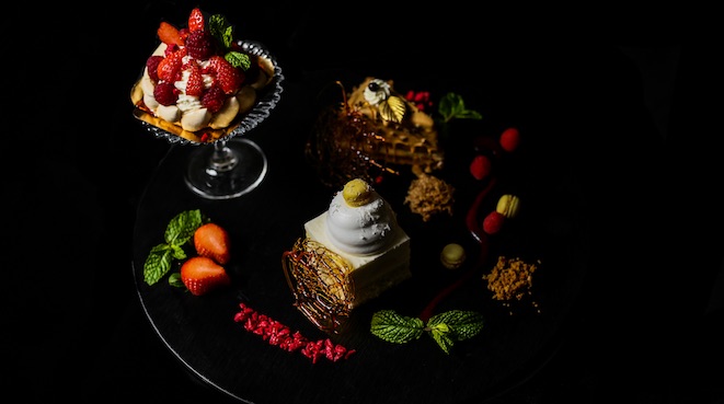 Ya para finalizar, el punto dulce con los postres: postre del día, surtido variado para dos personas, sabor a Sevilla de naranjas y azahar, bloc de marquesa de chocolate negro guanaja con leche, selección de tejitas de almendra y crujiente de manzanas.