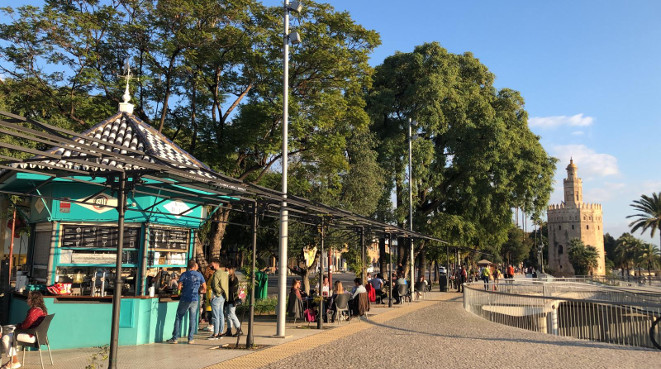 Ubicado entre el Guadalquivir, la torre del Oro y el Teatro de la Maestranza, Kiosco del Agua ofrece las mejores vistas de Sevilla. Uno de sus principales atractivos es ver la puesta de sol, que se va por Triana. Su especialidad son los cócteles, algunos con frutas naturales, entre los que destacan los mojitos con fresas y, llegado el verano, con sandía. Aunque el café y la extensa carta de copas siempre es una buena opción. Para picar, se puede elegir un clásico montadito.
