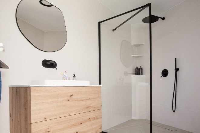 Con un estilo natural y minimalista, este baño de invitados enamora a cualquiera. El mueble en madera natural y la perfilería negra de la mampara a juego con la grifería, marcan el carácter de la estancia. Un baño de lujo que invita a relajarse y a disfrutar.