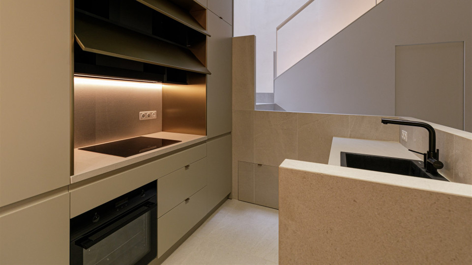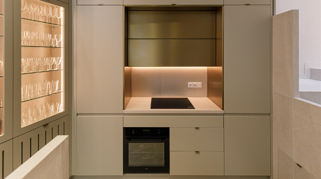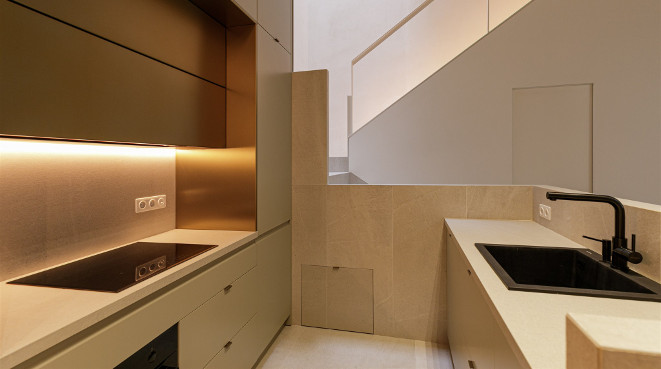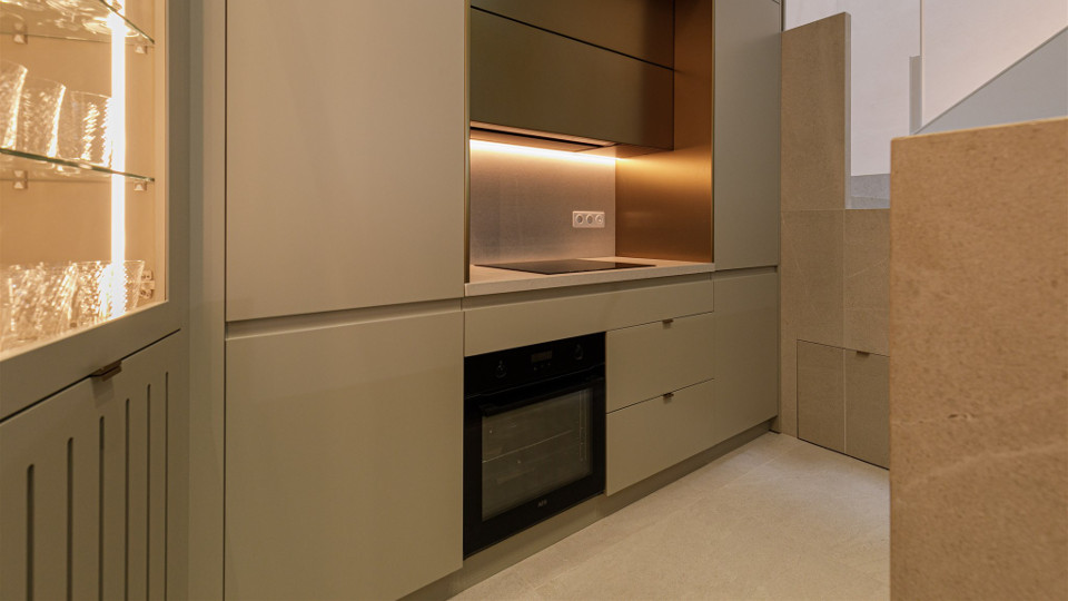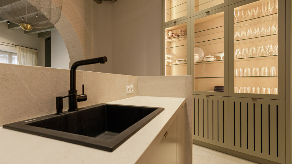 El color de las puertas, completamente personalizado, ha sido también un elemento diferencial de este proyecto. El estudio de arquitectura, encargado también del interiorismo, marcó como indispensable que cocina y paredes tuvieran el mismo tono. Una distribución muy práctica y un conjunto de detalles, como los discretos tiradores o la grifería oscura, terminan de dotar de elegancia a esta cocina que se convierte en protagonista central del espacio.