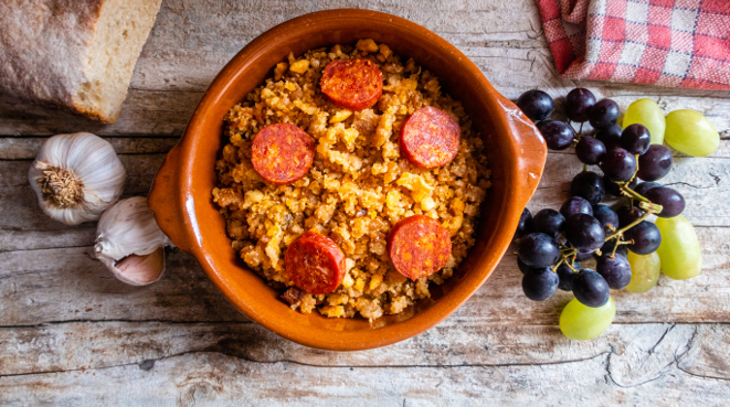 Elaboración: desmigamos el pan y lo colocamos en un bol para agregar el agua y la sal. Removemos y, a continuación, lo dejamos reposar durante 1 hora. Luego, el chorizo que hemos cortado en rodajas, lo pasamos durante unos minutos por la sartén y lo apartamos con su grasa. Lo mismo hacemos con la panceta cortada en tiras. Por otro lado, cortamos el pimiento y lo sofreímos junto a los ajos. Añadimos las migas de pan y cocinamos durante unos 20 minutos hasta que estén doradas. Ya sólo queda sumar el resto de ingredientes y todo listo para degustar.