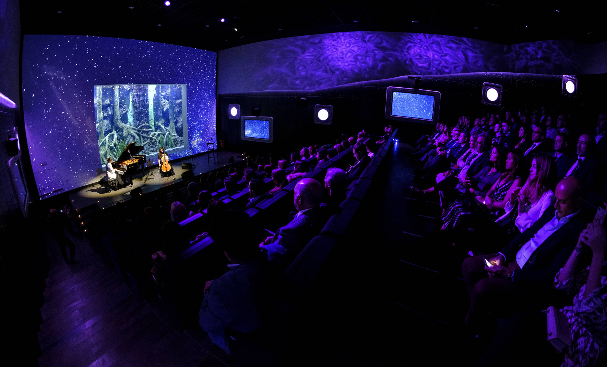 Uno de los espacios más especiales dentro del acuario es el Auditorio Global Omnium, una magnífica sala donde se ponen en marcha todos los sentidos: sonido envolvente, iluminación personalizada, aromas, pantallas que interactúan entre sí y la posibilidad de diseñar experiencias aumentadas en 360º hacen de este espacio un lugar con infinitas posibilidades para realizar un evento. Además, este auditorio con capacidad para 254 personas, tiene un valor muy especial, y es que el escenario (que cuenta con una pantalla de «visión infinita») está presidido por un acuario de grandes dimensiones, que reproduce un bosque amazónico con más de tres mil peces de colores.