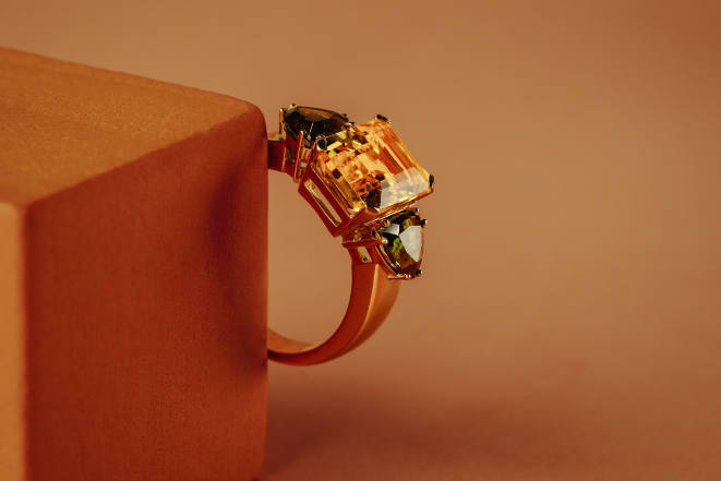Opción 1: anillo de la colección Triology en oro rosa con topacio amarillo y turmalinas verdes. Algo extraordinario para cada día.