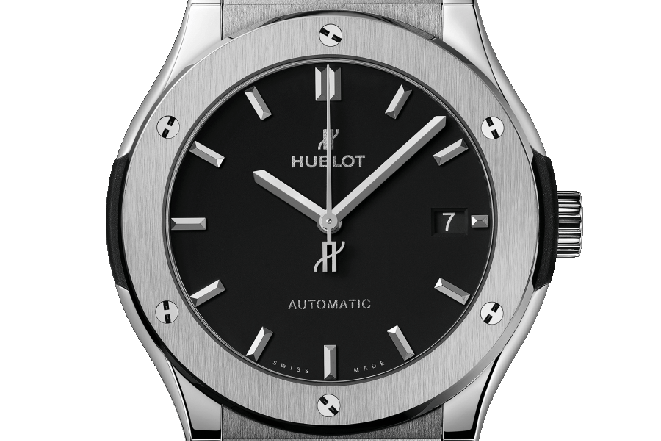 Opción 4: reloj Hublot Classic Fusion Titanium 42 de movimiento automático. Caja de titanio de 42 mm de diámetro hermética hasta 50 m. Esfera de color negro y correa de caucho. La elegancia reinventada.