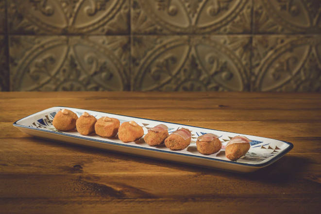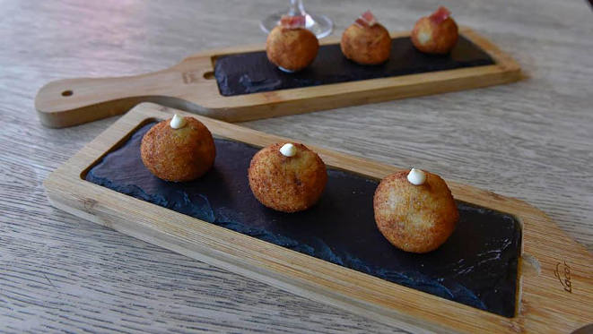 Entre la diversa selección de entrantes de Hummo, hoy ponemos el foco sobre el surtido de croquetas, un nuevo fichaje de su recién estrenada carta. Este plato ofrece dos variedades; de carrilleras al vino tinto con guanciale sobre una base de alioli de ajo negro. Por otro lado, de queso de cabra al romero con mayo de mojo, una conjugación de sabores maridada al milímetro.