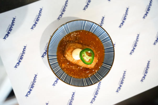 ¿No has probado aún las croquetas de carabinero al chilli crab? Aquí encontrarás una croqueta cremosa elaborada con carabinero y acompañada de un guiso de cangrejo al estilo chilli crab tailandés. «La idea es comer la croqueta como si fuera un trozo de pan para rebañar la salsa del guiso», apuntan desde el restaurante. En la parte superior de la croqueta encontramos un punto de mayo de kimchi y jalapeño para dar frescura.